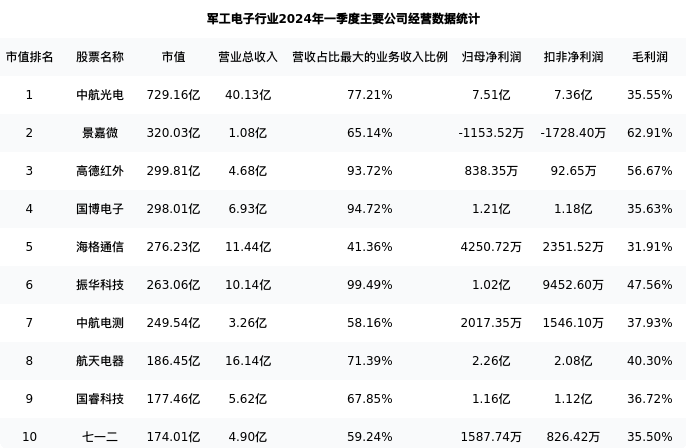 中航光电最新报告期数据为一季度,下表汇总了军工电子行业内市值靠前的公司一季度主要经营数据