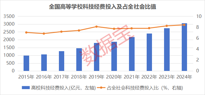 这些科研成果的落地离不开科研经费的强力支持。根据国家统计局数据,过去10年,我国高等学校科技经费投入从2015年的1000亿元以下稳步增加至2024年的3065.5亿元,2024年高等学校科技经费投入占全社会科技经费投入比值创历史新高,达到8.44%。
