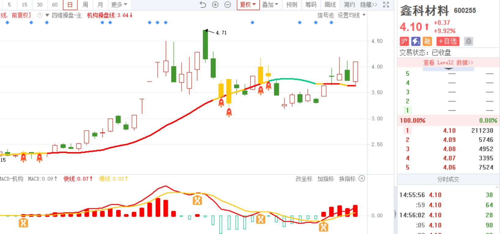 1)鑫科材料-四维操盘-近期出现火箭信号且底部量柱由绿转红