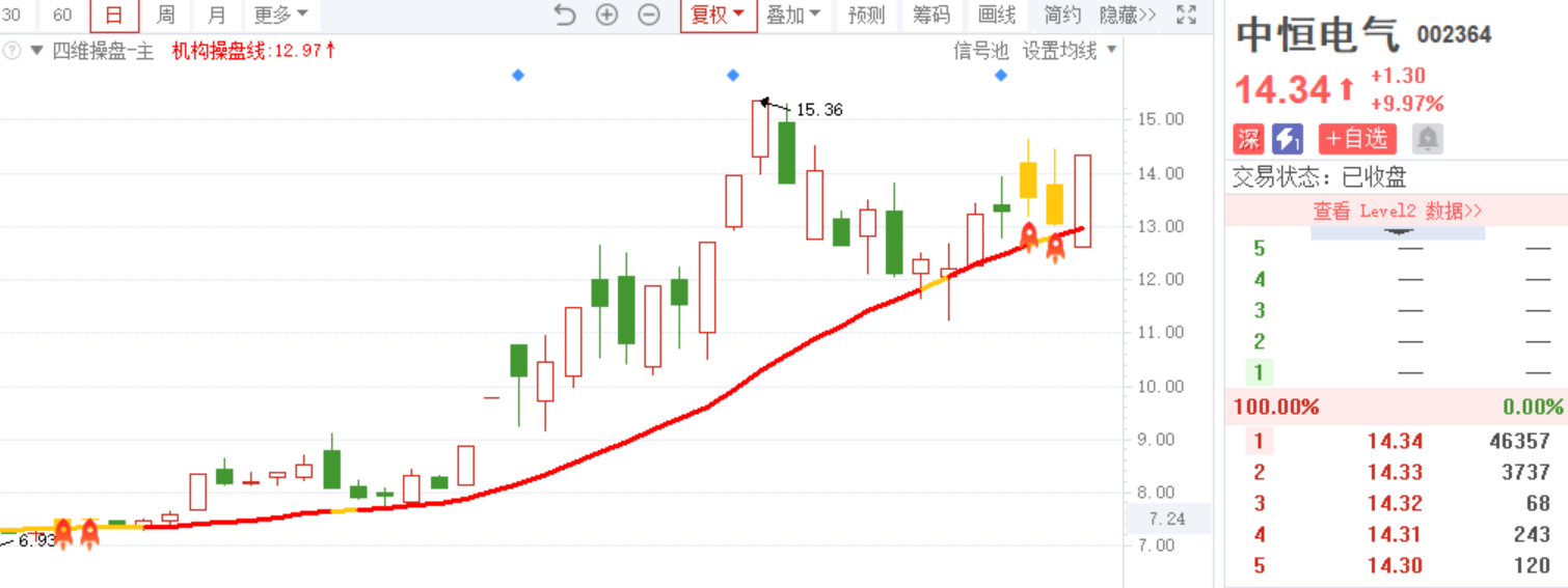 2)中恒电气-四维操盘-近期出现火箭信号且底部量柱由绿转红