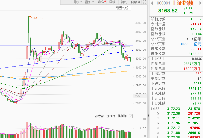 大盘分析及后市展望:今天早盘沪指在银行等红利资产的维稳下窄幅震荡,配合机器人等题材股的大涨下大盘一度翻红,但市场资金无意发力,应该和前期市场连续下跌没解套有关;随后临近午盘,很多连板的高位人气股如顺钠股份、海得控制、雄韬股份、国星光电等全面退潮跌停,市场信心再度崩溃,午后三大指数单边下行,毫无回头之意,直至收盘仅有机器人板块上涨,其余板块全线下跌,沪指失守3200收在3168点。