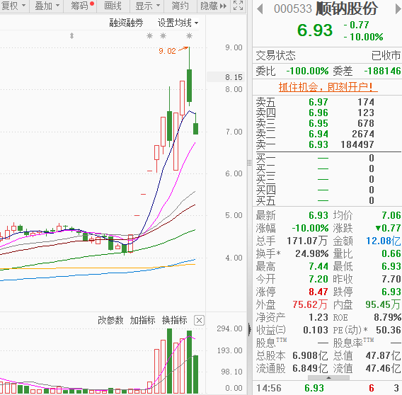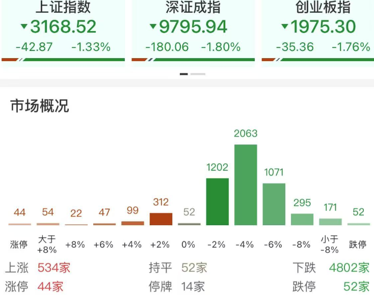 市场情绪,再度陷入冰点,行业板块罕见全线下跌,个股普跌,全市场超4800只个股下跌,逾百股跌超9%。今日共38股涨停,连板股总数13只,36股封板未遂,封板率为51%(不含ST股、退市股)。焦点高位人气股集体退潮:顺钠股份、海得控制、雄韬股份、国星光电等人气股跌停,康盛股份午后一度上演“天地板”行情,仅剩7连板美邦股份“一根独苗”。