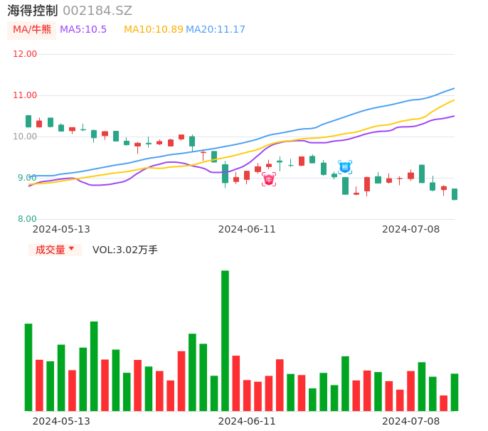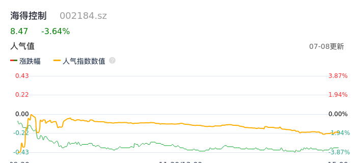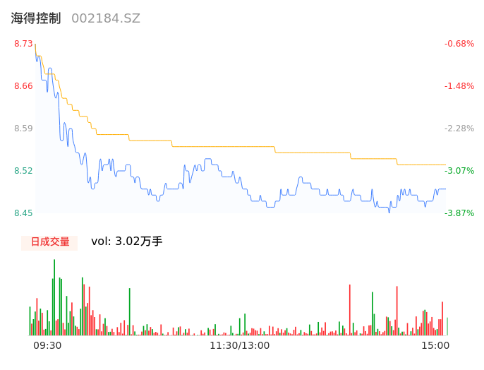 07月08日,海得控制收报8.47,股价涨幅-3.64%,成交金额2577.38万,换手率1.26%。
