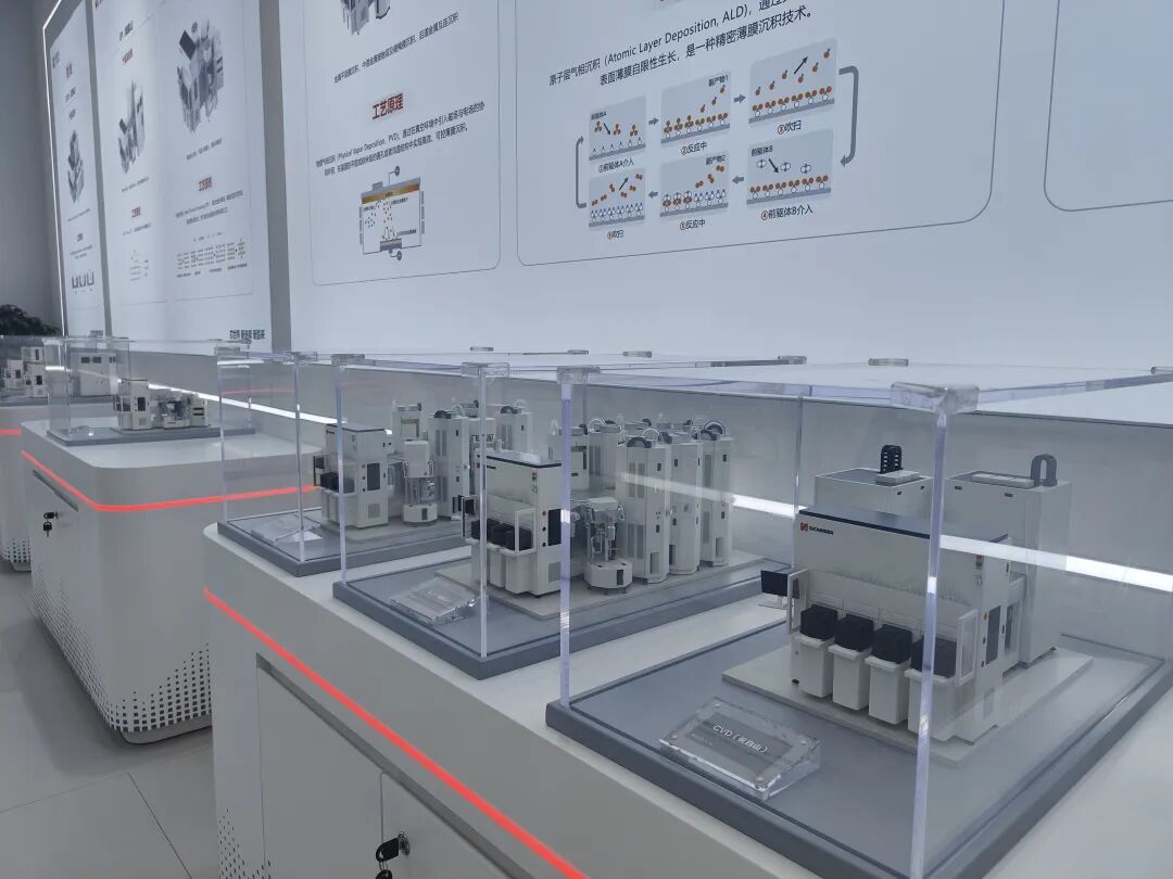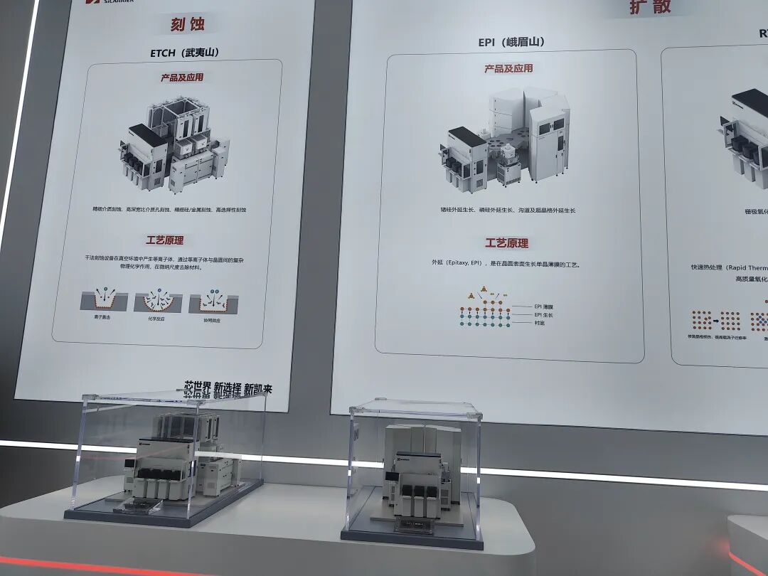 新凯来展台展出了光学检测BFI产品岳麓山、物理与X射线量测设备XPS赤霞山-XP、刻蚀产品ETCH武夷山、扩散产品EPI峨眉山和RTP三清山、薄膜产品PVD普陀山及ALD阿里山、CVD长白山。