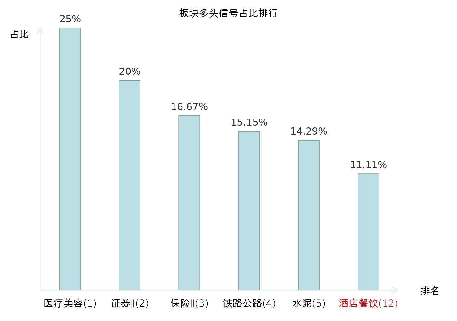 全市场所有行业板块中主力多头信号占比排名中,医疗美容板块位居第一。医疗美容板块名次提升最快,较昨日上升128位。