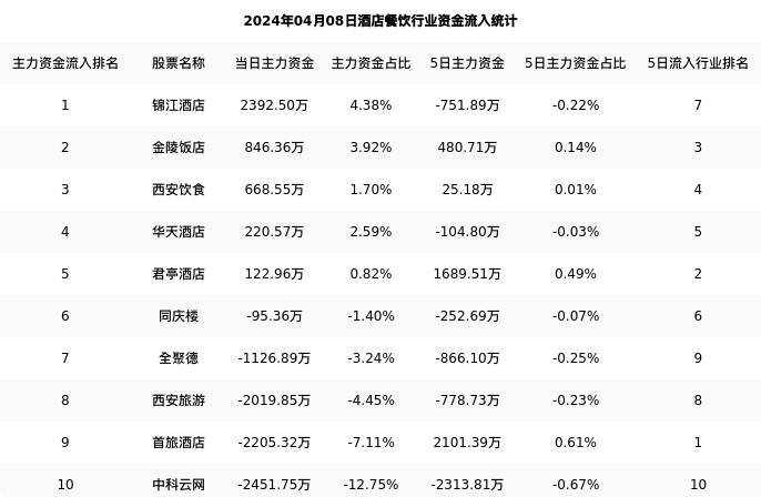 全聚德今日净流出1126.89万元,主力占比3.24%,在行业内排名:7/10;5日净流出866.10万元,主力占比0.25%,在行业内排名:9/10。