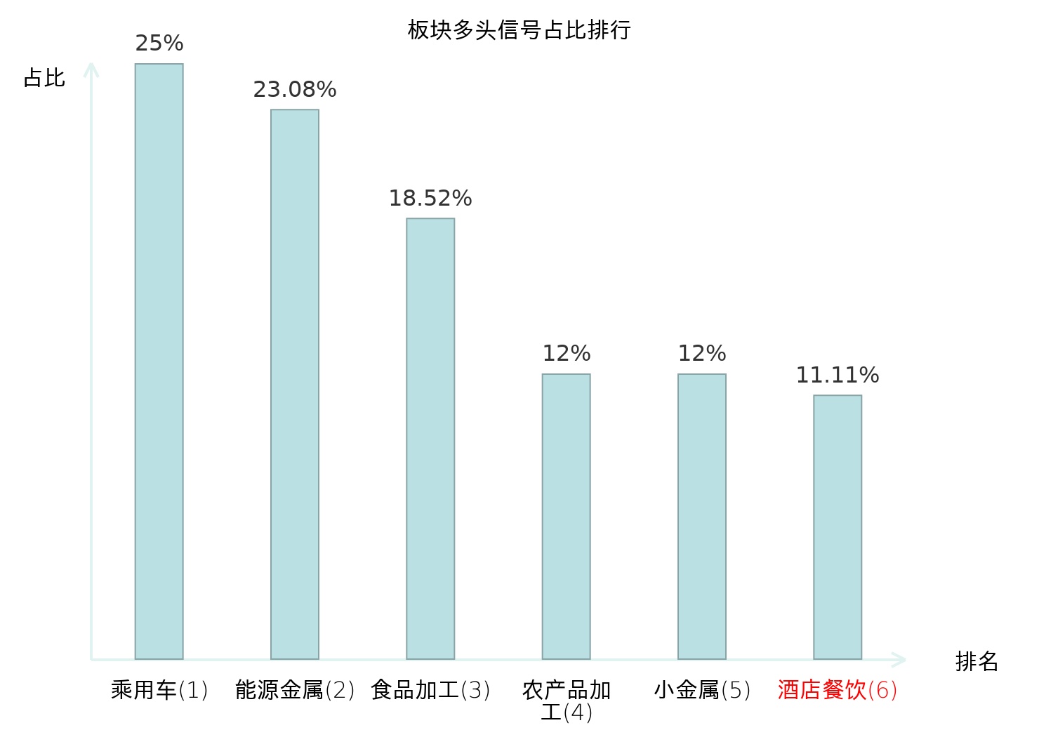 全市场所有行业板块中主力多头信号占比排名中,乘用车板块位居第一。乘用车板块名次提升最快,较昨日上升120位。