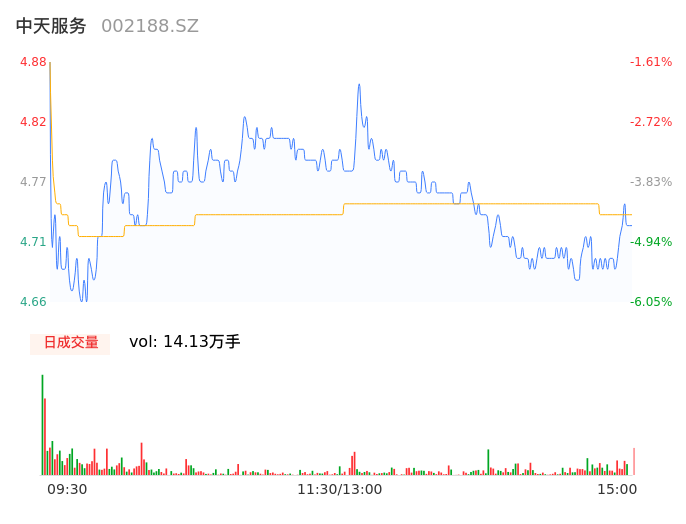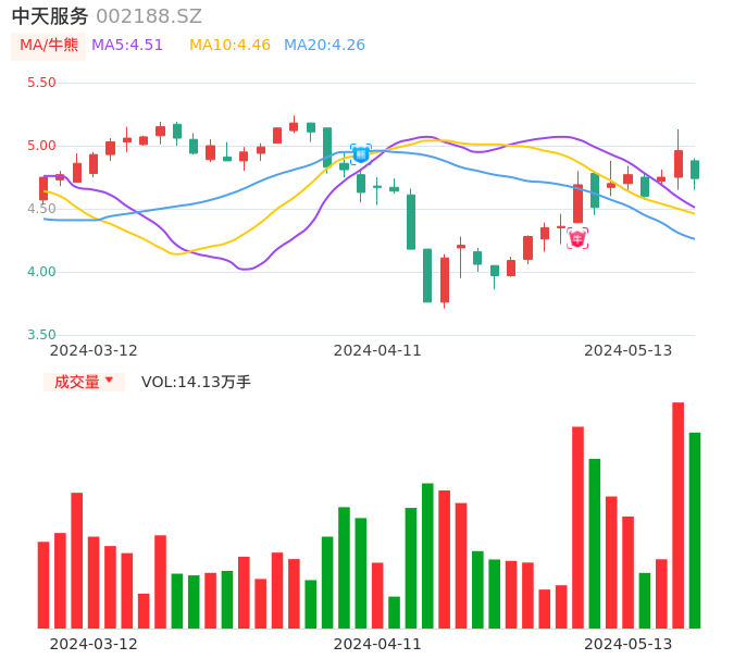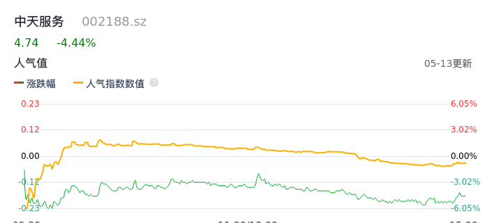 05月13日,中天服务收报4.74,股价涨幅-4.44%,成交金额6701.91万元,换手率5.87%。