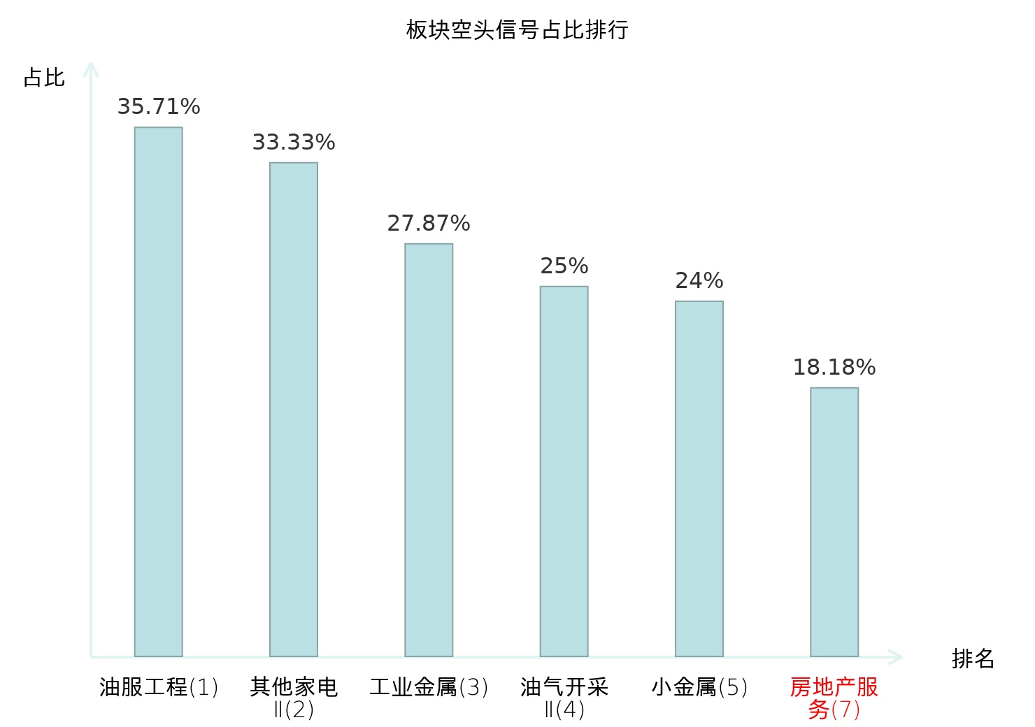 全市场所有行业板块中主力空头信号占比排名中,油服工程板块位居第一。工业金属板块名次提升最快,较昨日上升122位。