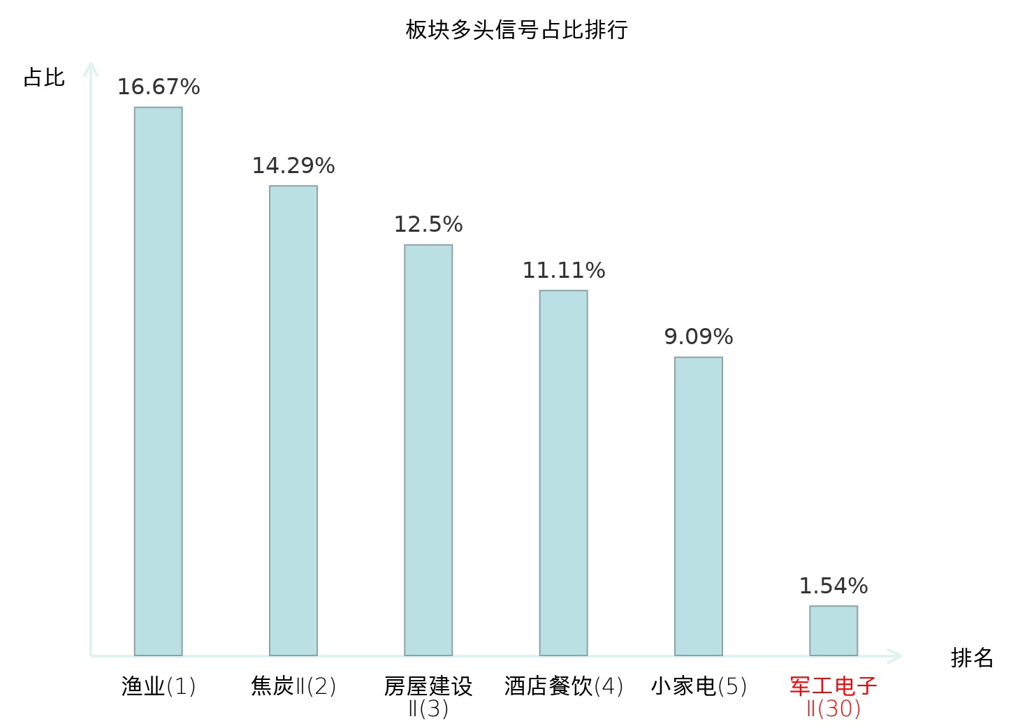 全市场所有行业板块中主力多头信号占比排名中,渔业板块位居第一。渔业板块名次提升最快,较昨日上升121位。