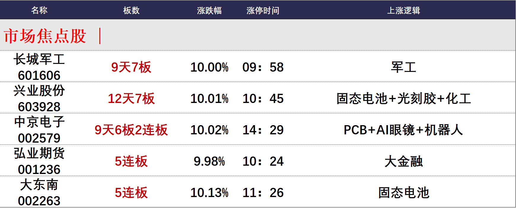 个股方面,全市场超4000只个股上涨,短线情绪回暖,上个交易日的9只连板股全线飘红且7只晋级。高位股走势强劲,长城军工12连阳并走出9天7板,兴业股份反包涨停收获12天7板。此外,20CM个股表现活跃,中光防雷3连板,恒宇信通、霍普股份2连板,国瑞科技4天3板,杭州园林4天2板。
