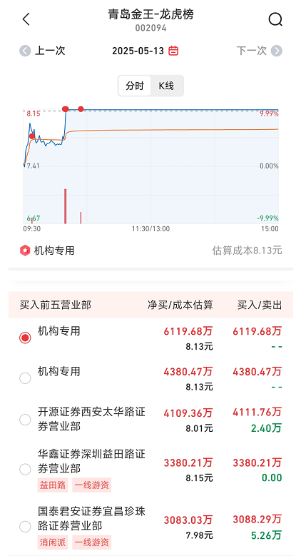 青岛金王昨日榜单两家机构买入一个亿,“消闲派”买入3000万,益田路买入3300万;消闲派更是昨天选出的风云游资,我们几乎快讲了一个月的“机游共振”,今日明牌上板,盘后显示新闸路也参与了进来,买入4000万,这种机会源源不断,你还要继续等下去么?