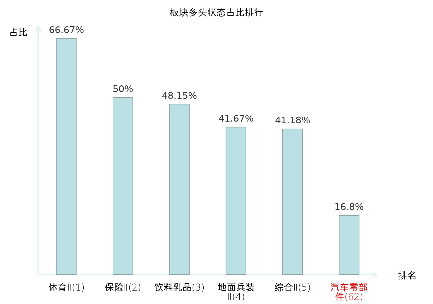 全市场所有行业板块中主力多头状态占比排名中,体育Ⅱ板块位居第一。种植业板块名次提升最快,较昨日上升70位。
