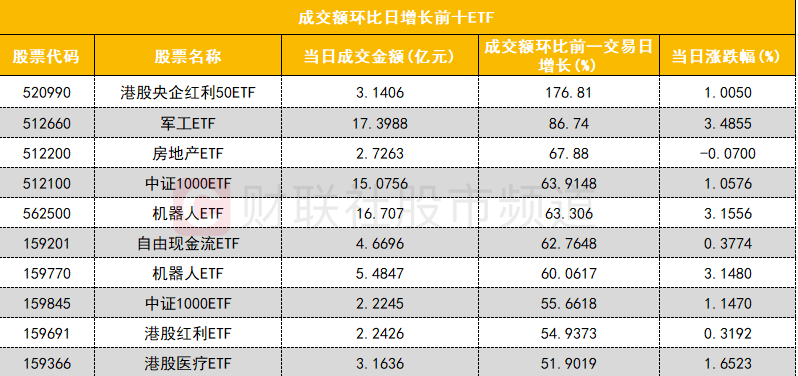 从成交额环比增长前十的ETF来看,港股央企红利ETF(520990)成交额环比增长176%位居首位;军工ETF(512660)成交额环比增长86%位居次席。