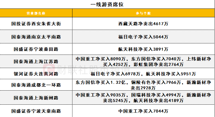 一线游资活跃度逆势下降,东方国信获两家一线游资席位合计买入超2亿;军工股中国重工获三家一线游资席位合计买入超2.4亿。