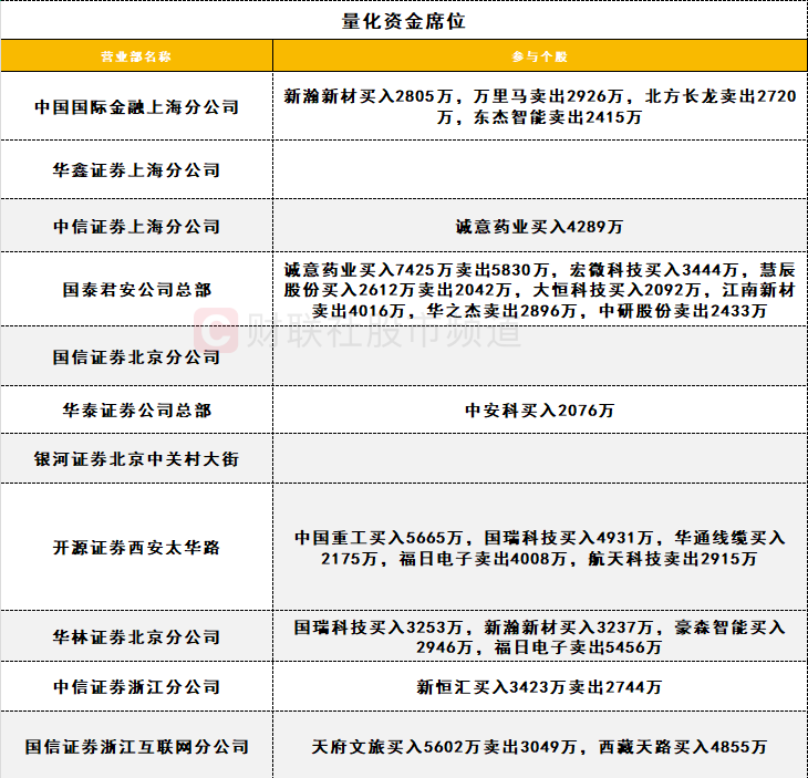 量化资金活跃度有所下降,中国重工获一家量化席位买入超5000万;诚意药业获一家量化席位买入,遭一家量化席位做T。