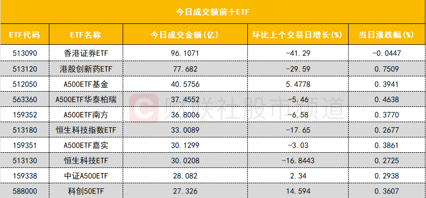 从成交额前十的ETF来看,香港证券ETF(513090)成交额位居首位,港股创新药ETF(513120)成交额位居次席。