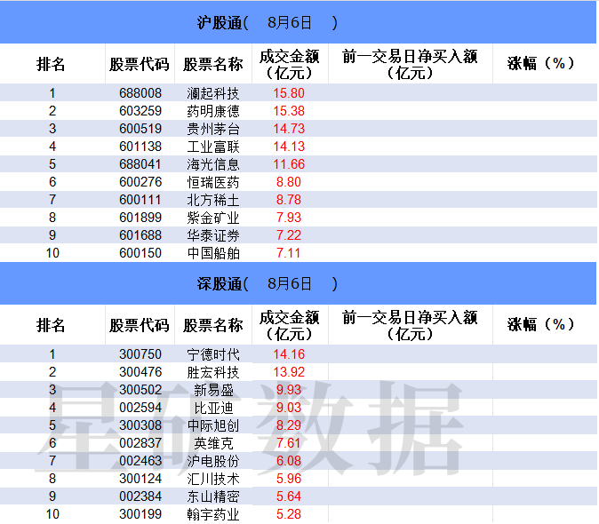 从沪股通前十大成交个股来看,澜起科技位居首位;药明康德和贵州茅台分居二、三位。