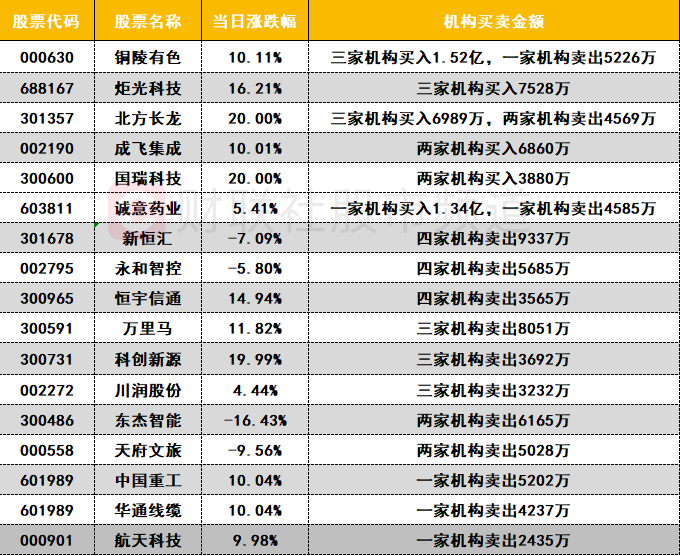 今日龙虎榜机构活跃度较高,买入方面,铜陵有色获机构买入1.52亿;军工股成飞集成获机构买入超6000万;诚意药业获机构买入1.34亿。