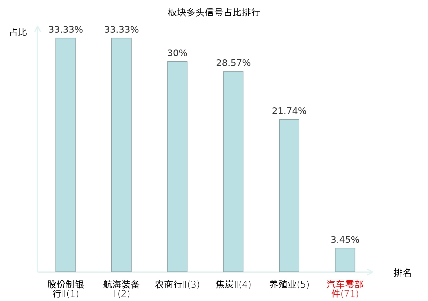 全市场所有行业板块中主力多头信号占比排名中,股份制银行Ⅱ板块位居第一。焦炭Ⅱ板块名次提升最快,较昨日上升119位。