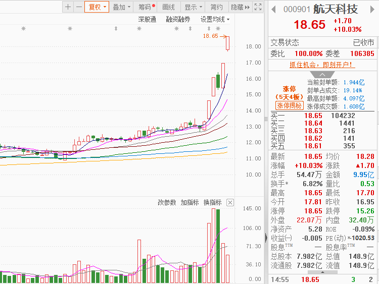 市场情绪:市场热点良性轮动,题材股全面开花,个股涨多跌少,全市场超4100只个股上涨,逾百股涨超9%。今日共78股涨停,连板股总数17只,28股封板未遂,封板率为73%(不含ST股、退市股)。焦点股方面,军工股长城军工8天6板,机器人概念股北纬科技6天5板,商业航天概念股航天科技5天4板、上海港湾3连板,PEEK材料概念股中欣氟材5天4板。