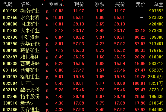 锂电产业链股盘中集体走高,截至收盘,永兴材料、国城矿业涨停,天华新能、中矿资源涨超8%,融捷股份、比亚迪等涨超5%,天齐锂业涨逾4%。