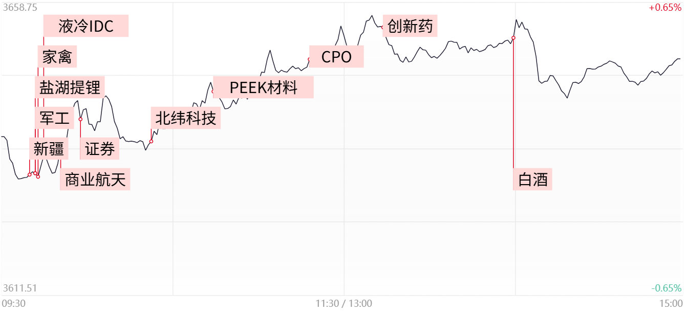 今日市场全震荡走高,创业板指涨近2%,沪指、深成指盘中均再创年内新高,与此同时量能再度增至1.8万亿之上,“价涨量增”的结构下指数或仍具冲高动能。因此短线仍先以5日线作为防守,在将其有效跌破以前,仍以震荡向上走势看待。而从盘面维度来看,今日市场呈现出普涨格局,PEEK材料、算力硬件、锂矿、军工、大金融等热门方向均于盘中活跃,并且上述细分的核心标的同样维持着趋势上涨结构,只要后市没有出现破坏性下跌的前提下,相关热点仍存反复活跃的机会,故应对上的重点仍在于把握轮动节奏,利用短线分歧回调低吸或具更高胜率。