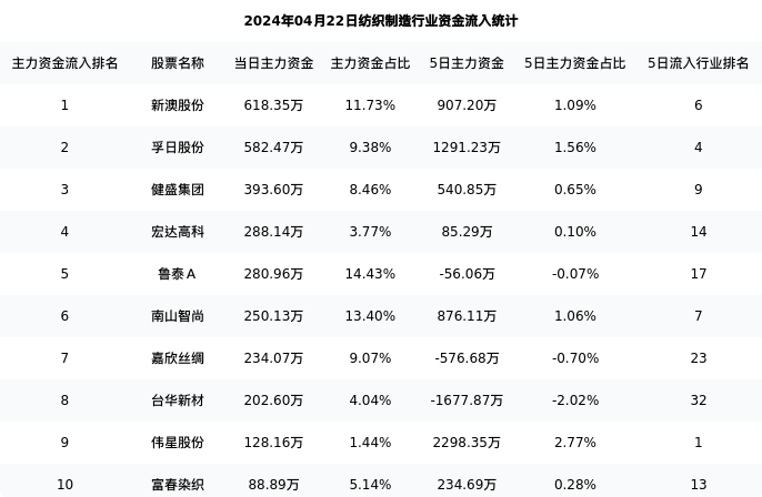 从主力资金流向来看,纺织制造行业今日主力资金流入2.33亿元,在所有申万二级行业中排名:3/131。