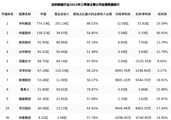 如意集团最新报告期数据为三季度,下表汇总了纺织制造行业内市值靠前的公司三季度主要经营数据