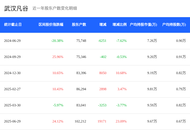 与行业数据对比,武汉凡谷所在的通信设备行业,截至2025年6月30日,平均股东数和平均户均持股市值未有具体数据。但根据武汉凡谷的表现来看,其股东户数的增长和户均持股市值的提升均优于行业平均水平,显示出较强的市场吸引力和投资价值。