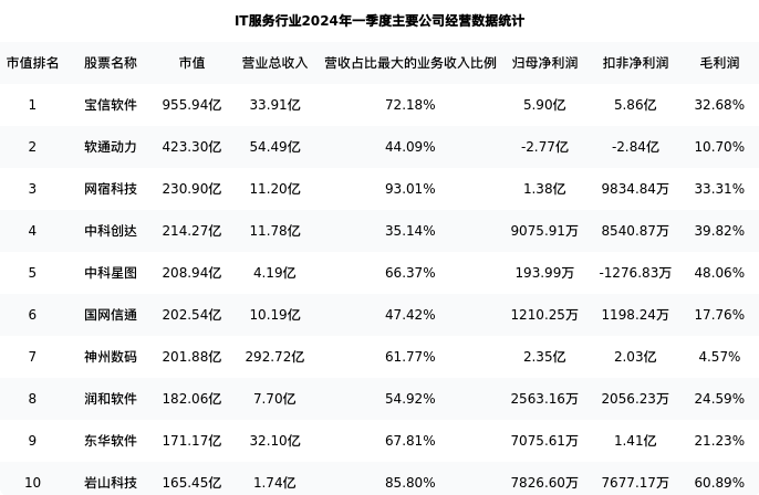 岩山科技最新报告期数据为一季度,下表汇总了IT服务行业内市值靠前的公司一季度主要经营数据