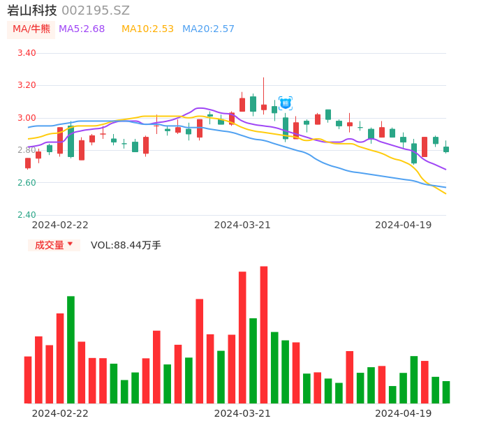 04月19日,岩山科技收报2.79,股价涨幅-1.76%,成交金额2.49亿元,换手率1.56%。
