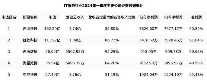 岩山科技最新报告期数据为一季度,下表汇总了IT服务行业内市值靠前的公司一季度主要经营数据