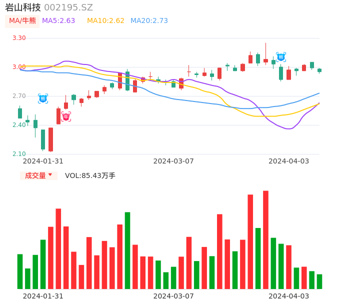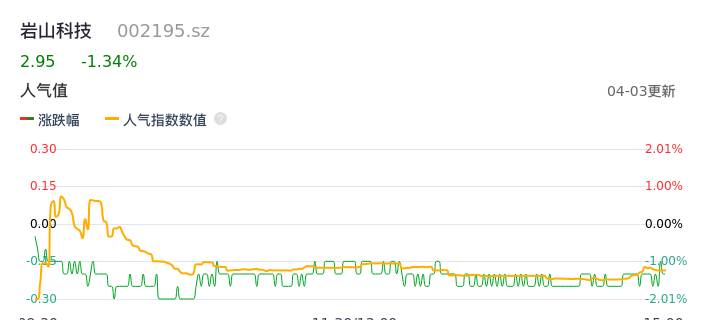 04月03日,岩山科技收报2.95,股价涨幅-1.34%,成交金额2.52亿元,换手率1.51%。