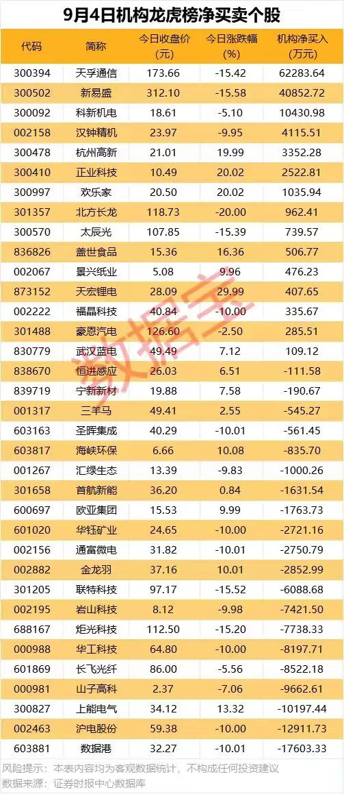 今日龙虎榜中,净买入的个股15只,净卖出的个股20只。天孚通信、新易盛、科新机电3股净买入金额居前,分别为6.23亿元、4.09亿元、1.04亿元。