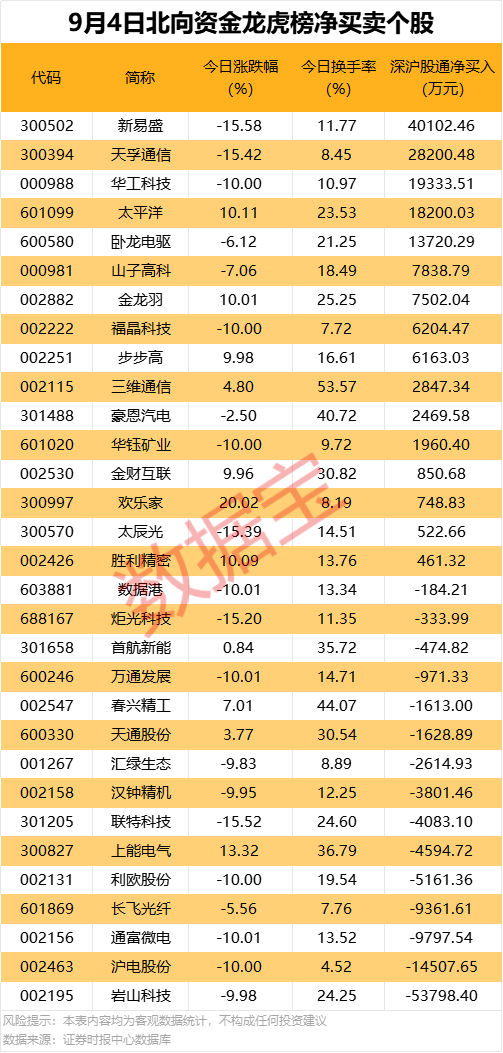 今日龙虎榜现身个股中,16股获北向资金净买入,其中新易盛、天孚通信净买入金额居前,分别为4.01亿元、2.82亿元;这2股也是今日机构龙虎榜净买入前两名。