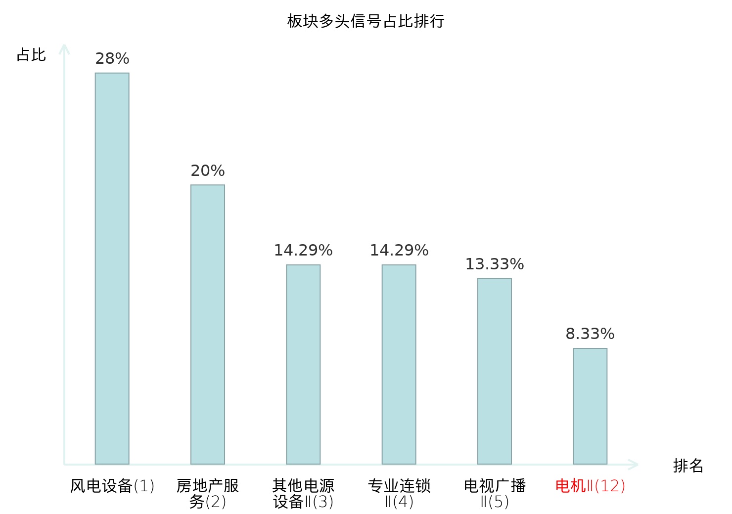 全市场所有行业板块中主力多头信号占比排名中,风电设备板块位居第一。专业连锁Ⅱ板块名次提升最快,较昨日上升116位。