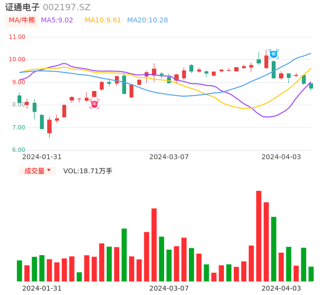 04月03日,证通电子收报8.73,股价涨幅-2.35%,成交金额1.63亿元,换手率3.50%。