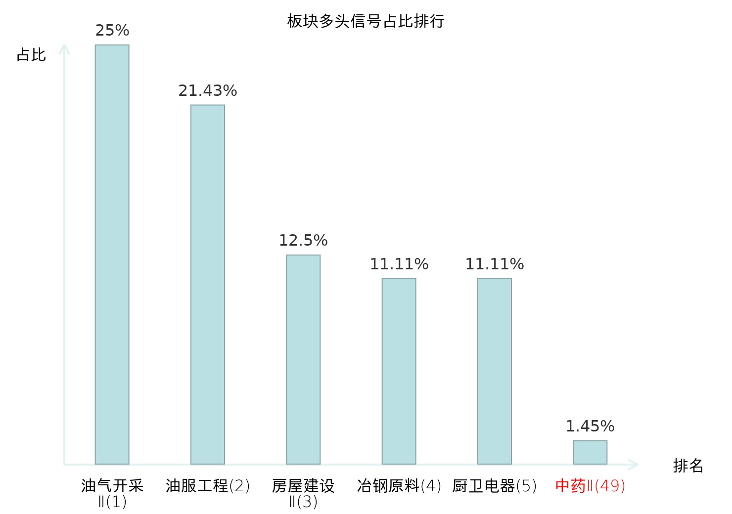 全市场所有行业板块中主力多头信号占比排名中,油气开采Ⅱ板块位居第一。油气开采Ⅱ板块名次提升最快,较昨日上升125位。