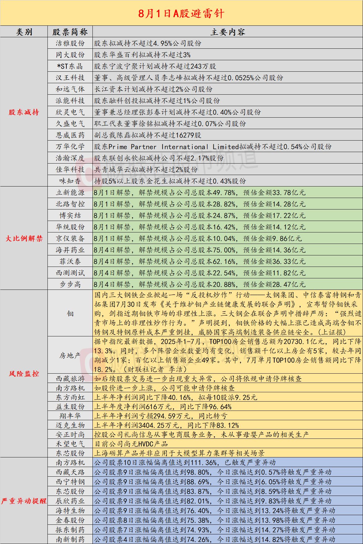 导读:财联社8月1日投资避雷针,近日,A股及海外市场潜在风险事件如下。国内经济信息方面包括:1)工信部数据显示,上半年我国规模以上互联网企业利润总额743.2亿元,同比下降8.3%;2)反投机炒作,三大钢企暂停钼铁采购;公司方面重点关注包括:1)9连板西藏旅游公告,如后续股票交易进一步出现重大异常,公司将依规申请停牌核查;2)9天8板南方路机提示,如股价进一步上涨,公司可能申请停牌核查;海外市场重点关注包括:1)美股三大指数集体收跌,Arm跌超13%;2)美元指数5月29日以来首次向上突破100关口。
