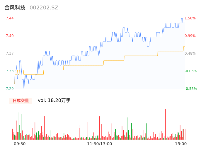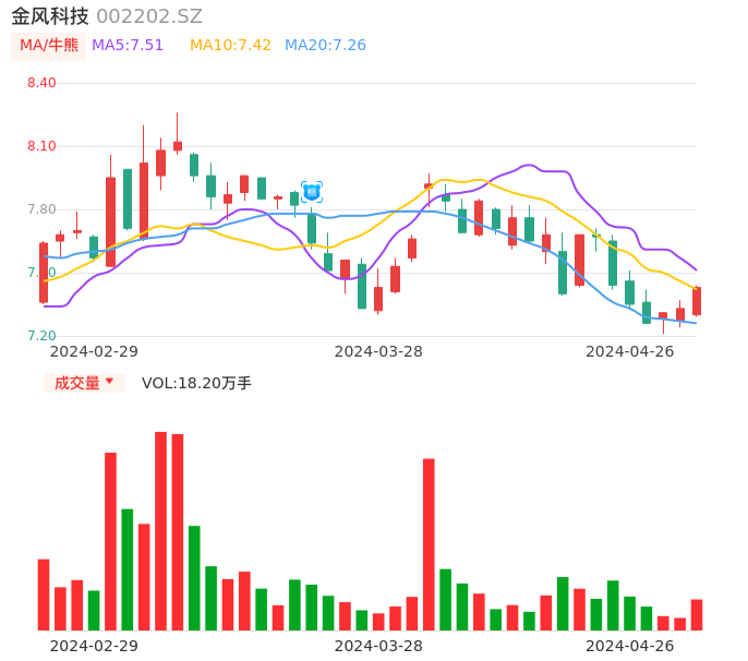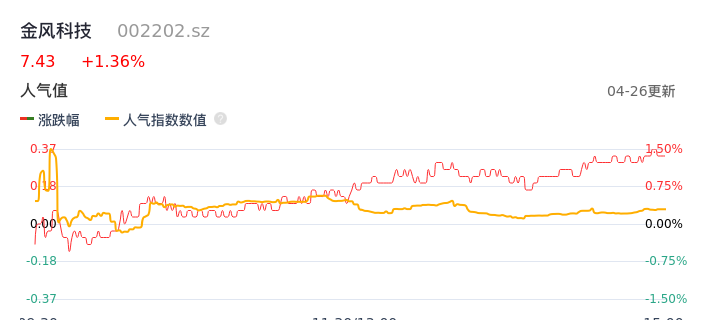 04月26日,金风科技收报7.43,股价涨幅1.36%,成交金额1.34亿元,换手率0.54%。