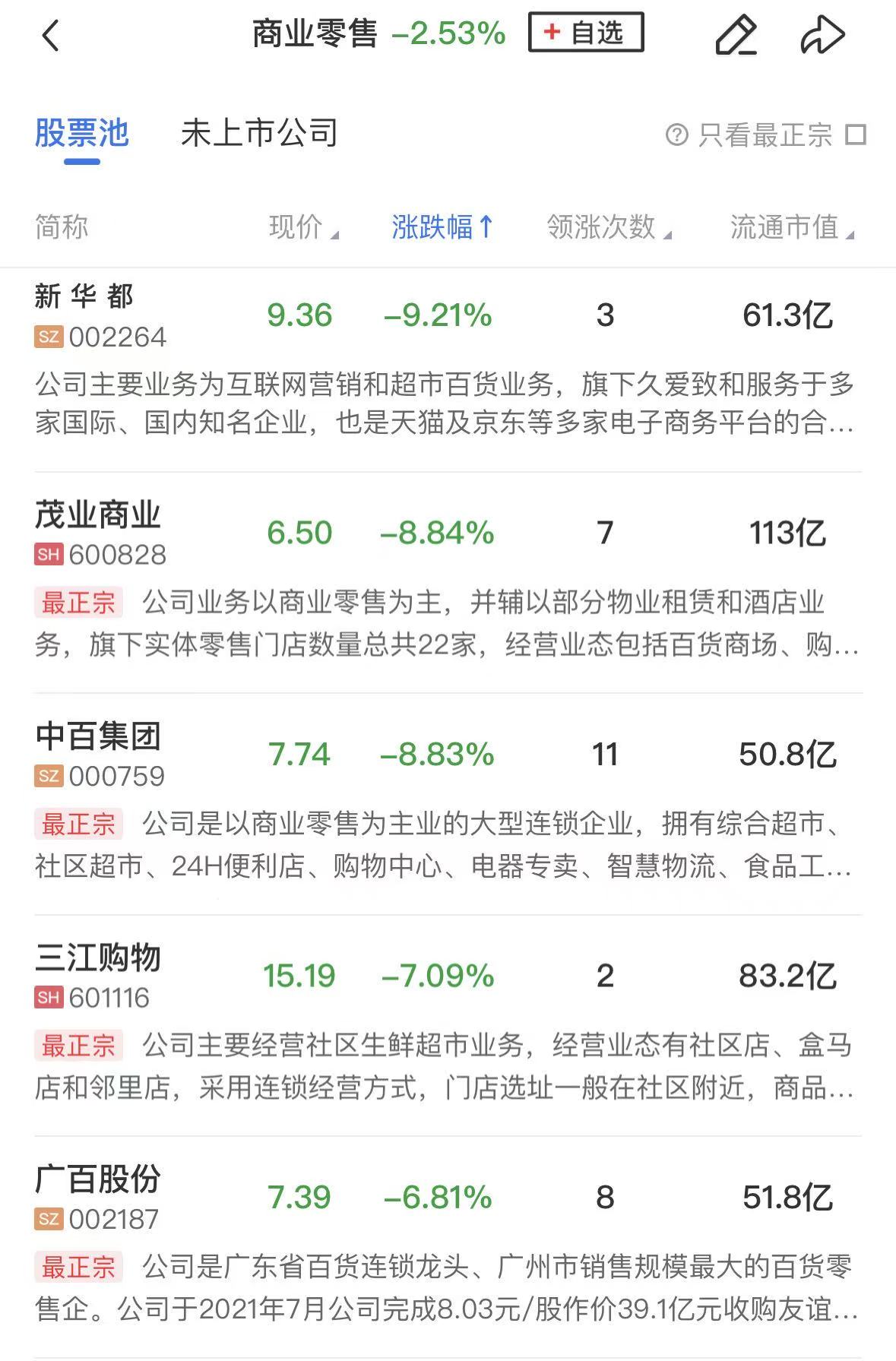 零售板块陷入调整,茂业商业、中百集团、三江购物、广百股份、国光连锁等个股均跌超6%。