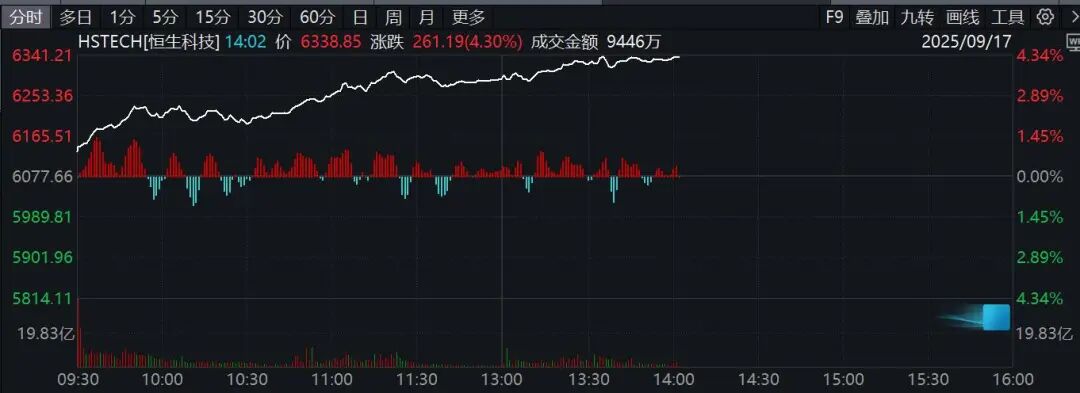港股走高,午后恒生科技指数涨幅一度扩大至逾4%,恒生指数涨逾1.5%。