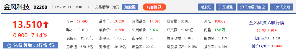 上证报中国证券网讯12月11日,金风科技H股开盘报12.66港元/股,盘中一度涨近8%,最高价报13.62港元/股。截至10时48分,金风科技H股报13.51港元/股,涨7.14%。同时,金风科技A股涨停。