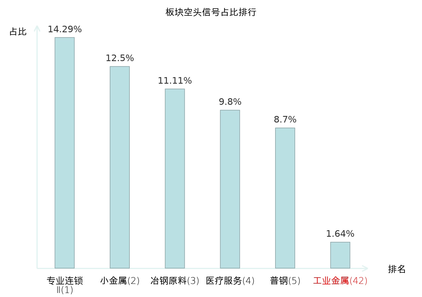全市场所有行业板块中主力空头信号占比排名中,专业连锁Ⅱ板块位居第一。军工电子Ⅱ板块名次提升最快,较昨日上升106位。