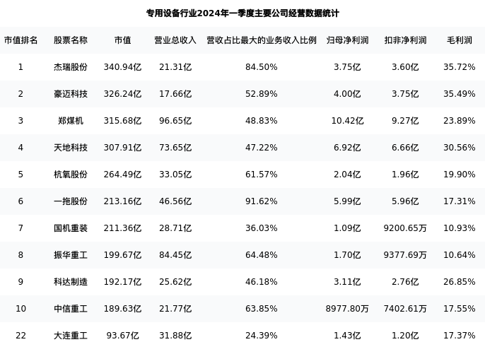 大连重工最新报告期数据为一季度,下表汇总了专用设备行业内市值靠前的公司一季度主要经营数据