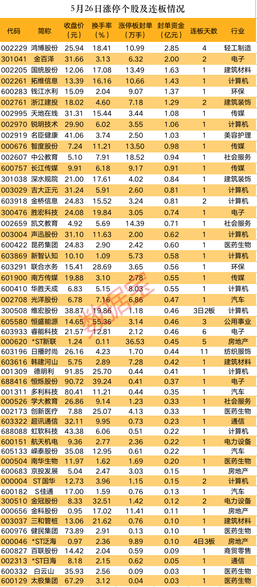 5月26日,沪深两市52只股涨停,包含5只ST股。另外,17股封板未遂,整体封板率为74%。