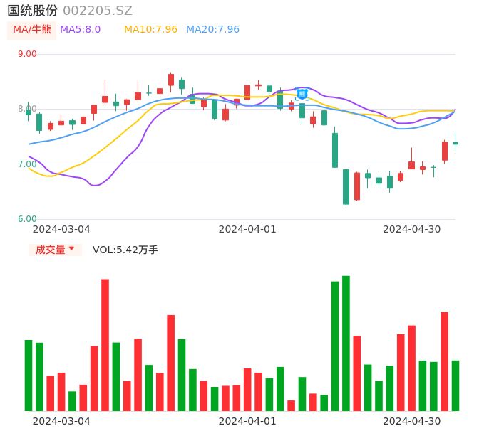 04月30日,国统股份收报7.36,股价涨幅-0.54%,成交金额3985.90万元,换手率2.92%。