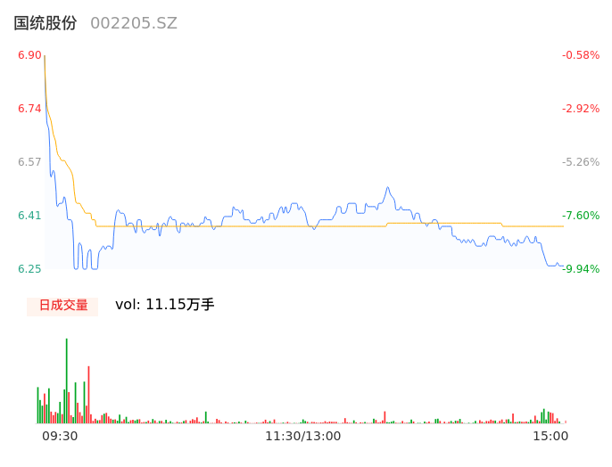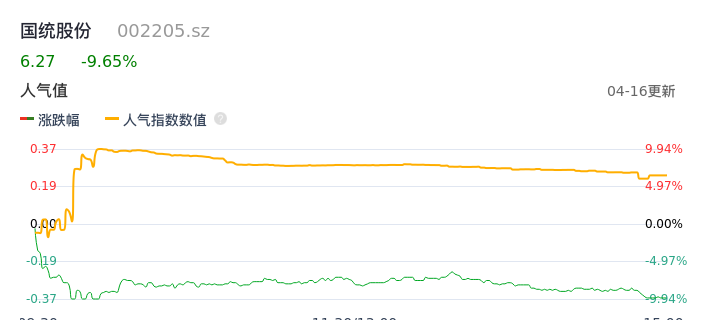 04月16日,国统股份收报6.27,股价涨幅-9.65%,成交金额7105.33万元,换手率6.00%。
