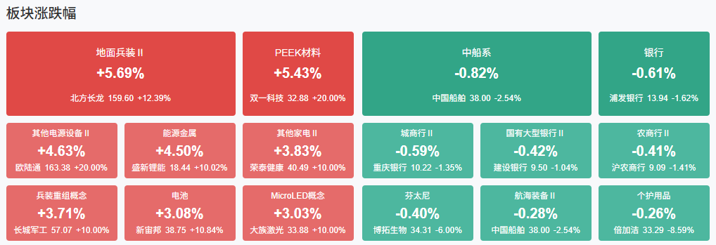 板块方面,PEEK材料、锂矿、CPO、PCB等板块涨幅居前,银行、电力、黄金、油气等板块跌幅居前。截至收盘,沪指涨0.51%,深成指涨1.48%,创业板指涨1.99%。